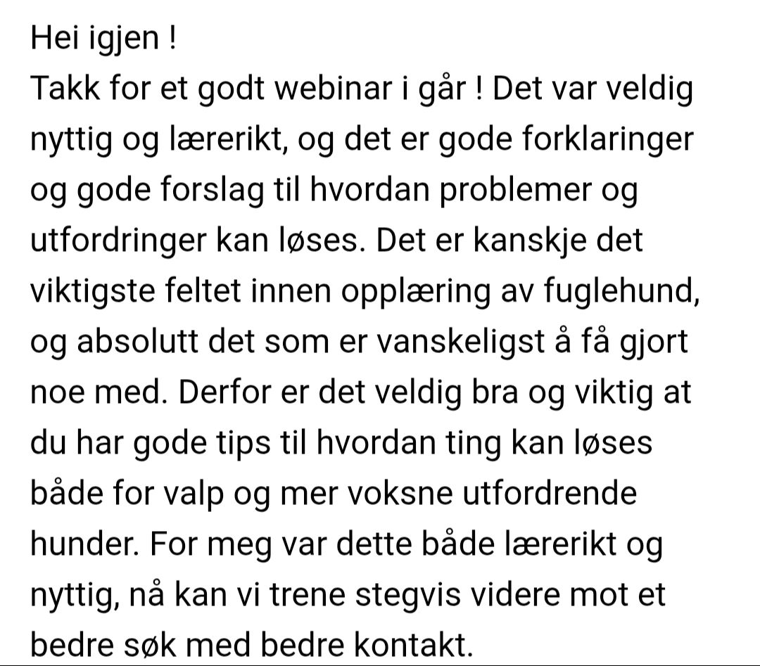 I dette webinaret går vi rett på sak: Du lærer hvordan du trener jaktsøket – grunnmuren for god jakt, flyt i terrenget og mindre tid med nesa i GPS-en. Med et godt søk vil dere også få gleden av å finne enda mer fugl.